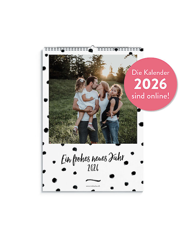 Wunderschöner Familienkalender 2026 mit deinen Fotos im einzigartigen Ma'Loulou Design. Perfekt um eure liebsten Fotoerinnerungen festzuhalten. Für jeden Monat gibt es ein Foto plus ein Titelseite. Einfach das schönste Geschenk für sich als Familie, Grosseltern, Gotti und Götti u.s.w.